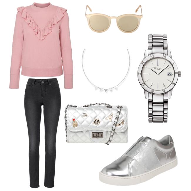 Hey ihr Lieben, Jeans und Sweatshirt sind eine Kombination, die jeder gerne mag. Die Rüschen machen das rosafarbene Sweatshirt zu einem Hingucker. Silberne Accessoires verleihen dem Look ein wenig Glammour.