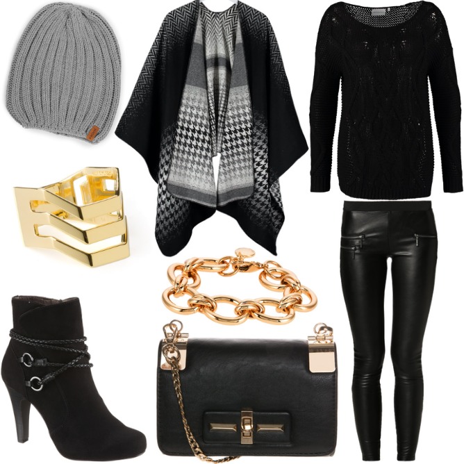 Hey ihr Lieben, da der Frühling noch auf sich warten lässt, haben wir auch heute wieder ein eher dunkles Outfit für euch, das mit funkelnden Accessoires allerdings auch einige Highlights bereit hält. Wer auf seinen Wintermantel keine Lust mehr hat und trotzdem nicht frieren möchte, könnte an dem locker fallenden Cape von Esprit Gefallen finden, das es aktuell sogar 20€ günstiger bei Zalando gibt. Passend dazu eignen sich perfekt die Kunstleder-Leggings und ein schlichter Strickpullover. Um dem Look ein wenig Chic zu verleihen, könnt ihr zum Beispiel die High Heel Stiefeletten von Tamaris und die mit goldenen Details versehene Handtasche aus dem Hause Urban Expressions kombinieren. Unser Lieblingsstück dieses Outfits ist allerdings das kleinste: Der avantgardistische Ring des Labels Maria Black. Dieser ist zwar nicht gerade günstig, dafür aber ein absoluter Hingucker (und nebenbei bemerkt: 925 Sterling Silber vergoldet). Um der Kälte zu trotzen, haben wir für euch eine graue Strickmütze von Nixon herausgesucht, die derzeit im Kolibrishop um 20% reduziert ist und perfekt zu dem Strick-Cape passt. Ein warmes Outfit kann also auch elegant sein… :-)