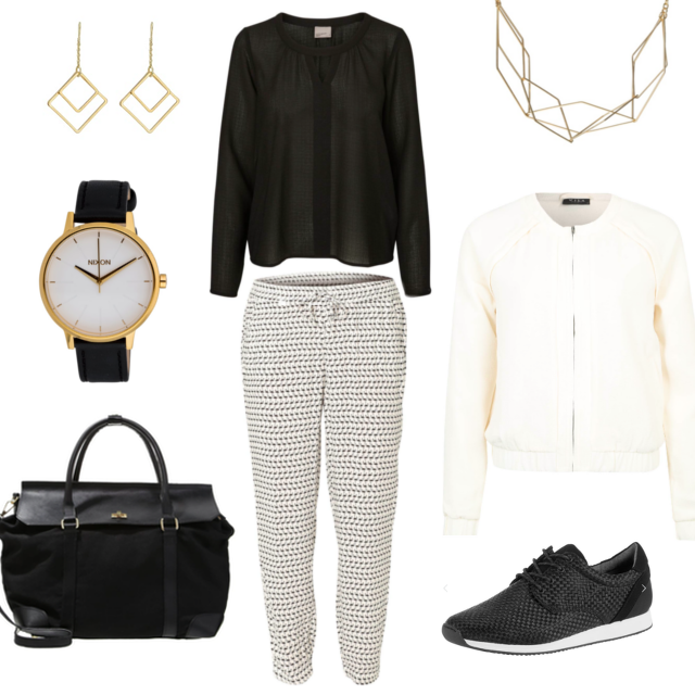 Hallo ihr Lieben, heute haben wir ein super schönes schwarz-weißes Outfit zusammengestellt. Es ist super für einen Stadtbummel aber auch durchaus für einen Tag im Office bestens geeignet. Was sagt ihr zu der tollen und super lässigen Hose von Mavi? Wir finden sie besonders in Kombination mit der eleganten schwarzen Bluse von Vero Moda einfach klasse. Auch die stylische Jacke von Vila ist ein wahrer Blickfang und lässt sich super kombinieren. Unser Geheimtipp: die ultra coole Tasche von Mint & Berry, die gerade sogar reduziert erhältlich ist! Die schwarzen Sneaker von Vagabond lassen sich sowohl eher lässig als auch schick für den Officeloook kombinieren. Abgerundet wird das Outfit durch die geometrischeSweet Deluxe, die schöne Uhr von Nixon und die Ohrringe von Tomshot. Wir wünschen euch ganz viel Spaß mit diesem Look!